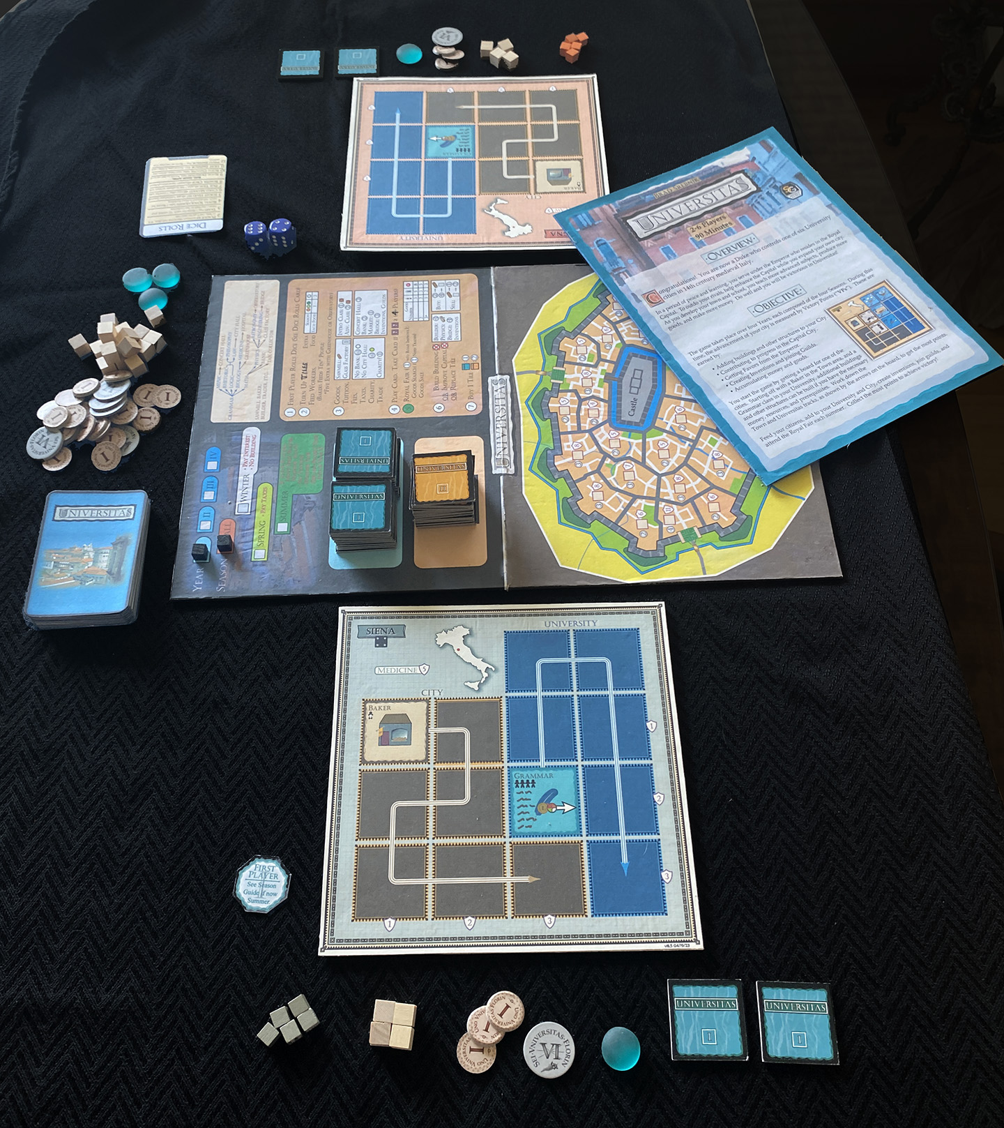In the game you are a Duke who controls one of six University cities in 14th century medieval Italy. You serve under the Emperor who resides in the Royal Capital. To outdo your rivals, help enhance the Capital while you expand your own city. As you develop your town and school, you teach more advanced subjects, produce more goods, and make more money.